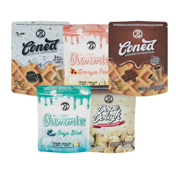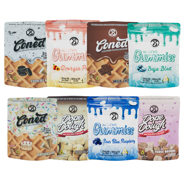 - 8 Pac k: Milk Chocolate 2 count Cones, Cookies & Creme 2 count Cones, Chocolate Chip 20 count Dope Dough, Baja Blast 900mg Gummies, Georgia Peach 900mg Gummies, Birthday Cake 2 count Cones, Sour Blue Raspberry 900mg Gummies, Fudge Brownie 20 count Dope Dough.