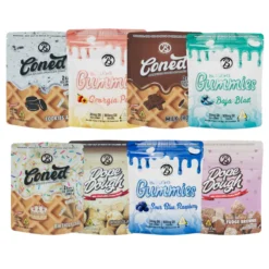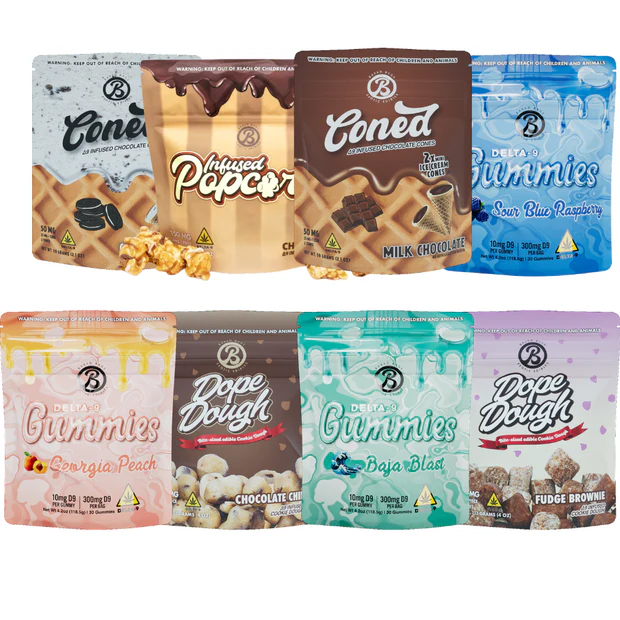 - 8 Pack: Milk Chocolate 2 count Cones, Cookies and Cream 2 Count Cones, Chocolate Chip 20 count Dope Dough, Blue Raspberry 300mg Gummies, Georgia Peach 300mg Gummies, Baja Blast 300mg Gummies, Chocolate Caramel Popcorn 150mg, Georgia Peach 300mg Gummies, Fudge Brownie 20 count Dope Dough.